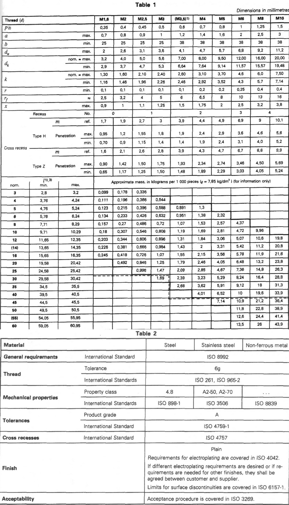 Pan head screws with type H or type Z cross recess-Product grade A(ISO 7054:1994)