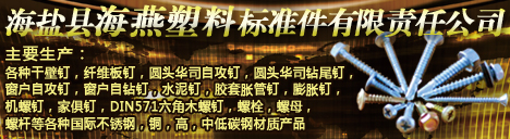 本公司生产各种钻尾螺丝、干壁钉、单线钉、华司钻尾钉、华司尖尾、水泥螺丝、 瓦楞定、法兰膨胀、复合垫片自攻自钻、塑料垫片自攻自钻、塑料胀管钉、内膨胀、热水器挂件、螺栓、螺母、垫片、六角木螺丝、角码...