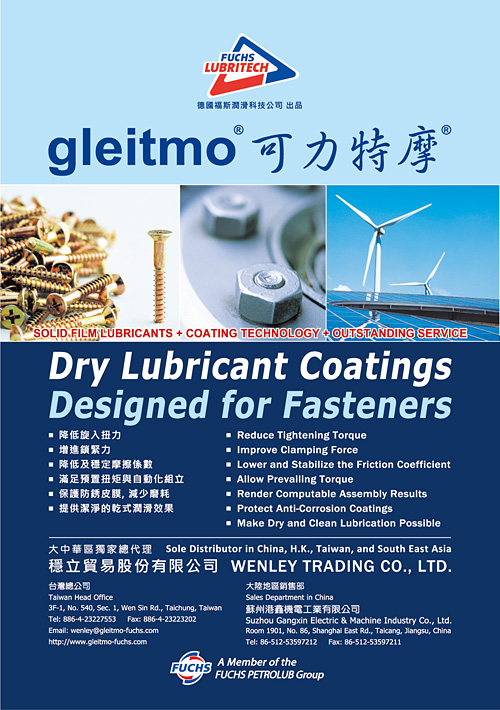 穏立贸易股份有限公司成立于1976年,主要经营项目为金属表面处理添加剂、工业用特种固体干膜润滑剂、紧固件专用润滑水蜡。稳立贸易为德国福斯润滑科技集团之 GLEITMO (可力特摩) 固体干膜润滑产品在大中华及东南亚区的总代理,负责销售并提供相关润滑处理技术、咨询服务。 德国福斯润滑科技集团 (Fuchs Lubritech) 专精于各种工业用特种润滑剂逾60年,为全球润滑剂市场之先驱。除具强大的研发团队,福斯润滑科技公司在德国更拥有一涂覆中心,对各种产品的涂覆能提供实际应用经验及解决方案。福斯润滑科技出品 之 GLEITMO (可力特摩) 固体干膜润滑剂能稳定摩擦系数、有效降低紧固件及其他各类零组件之摩擦与磨损,甚能抗极压、耐高低温,常为欧美各大汽车厂及其他行业知名厂商指定或推荐使用。 gleitmo 全系列产品种类/型号众多,若有任何型号需求,请直接与我们联络。 亦欢迎浏览我们的网站,探索适合您的产品及更多干式润滑技术相关知识! 稳立贸易官方网站: www.gleitmo-fuchs.com